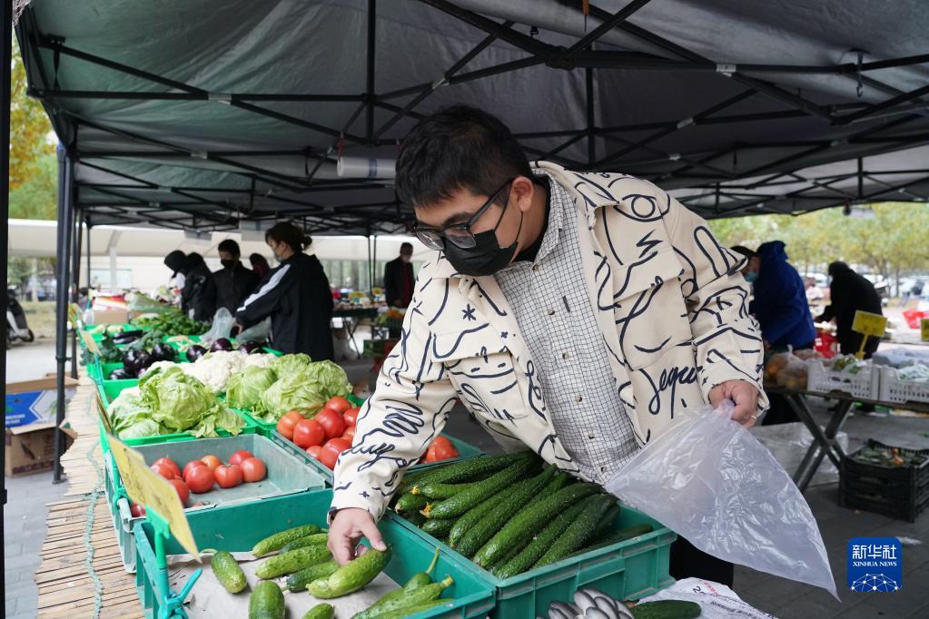 在金隅·山樾嘉園小區,北京科技大學應屆畢業生石全在小區內的便民菜站選購蔬菜(10月23日攝)。
