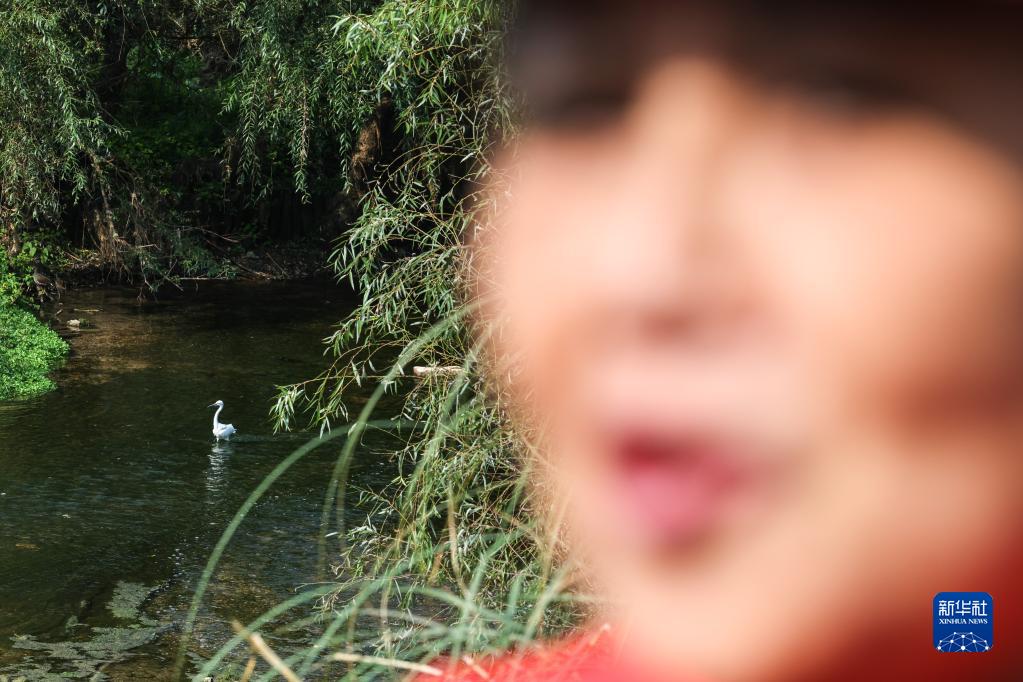 11月4日,在貴州貴陽,周余慶在花溪國家城市濕地公園內巡河,她身后一只白鷺在濕地里棲息。