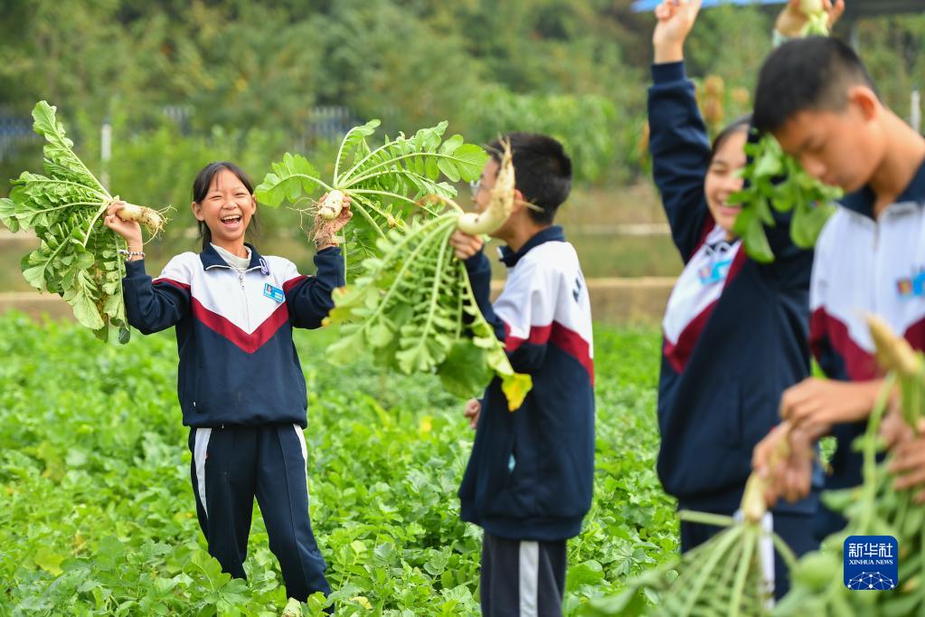 11月4日,在長沙市天心區明德啟南中學,學生們在農場向同學展示剛收獲的蘿卜。