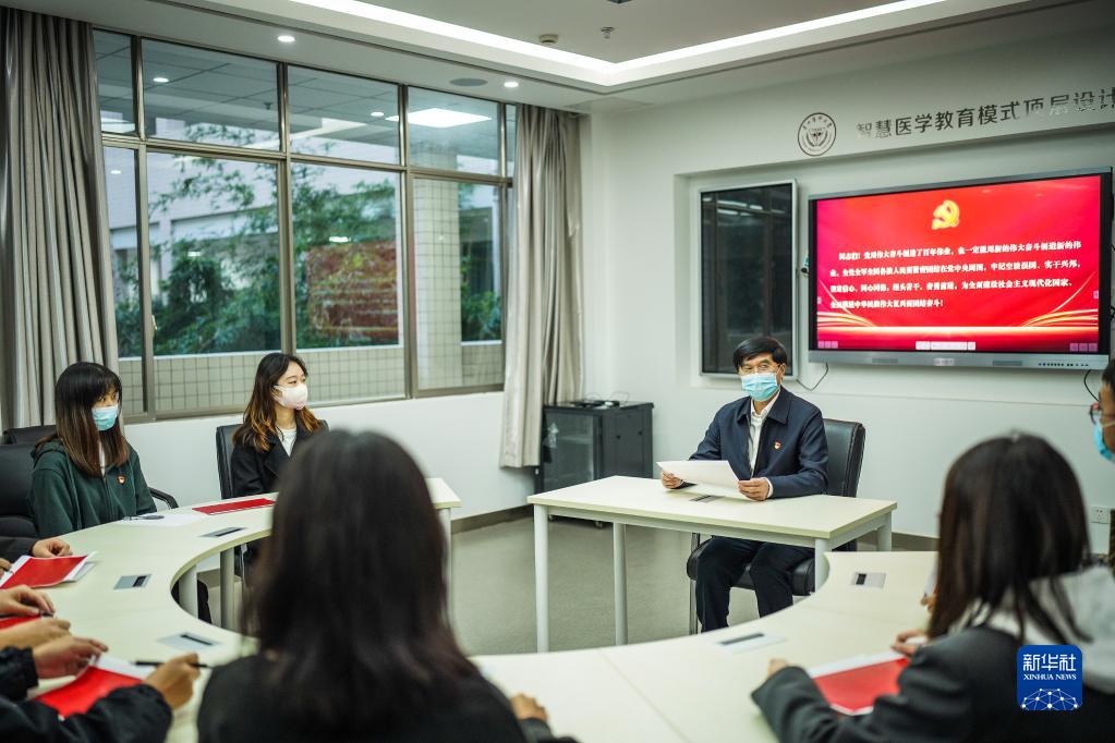 梁貴友(右三)在貴州醫科大學臨床技能中心向臨床醫學院本科生黨支部成員交流宣講二十大精神(11月2日攝)。