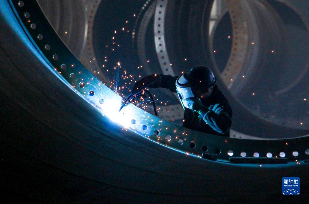 11月4日,在內蒙古通遼市天順風電設備有限公司廠房,工人在生產線上工作。