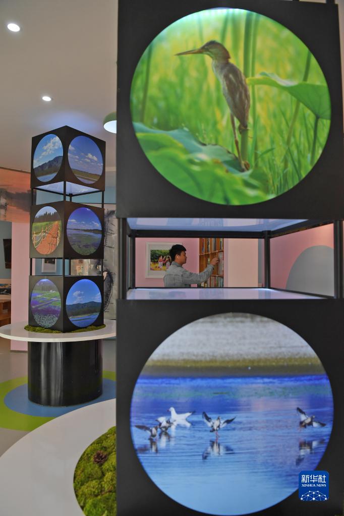 在天津薊州州河國家濕地公園科普宣教中心,工作人員在整理科普書籍(11月2日攝)。