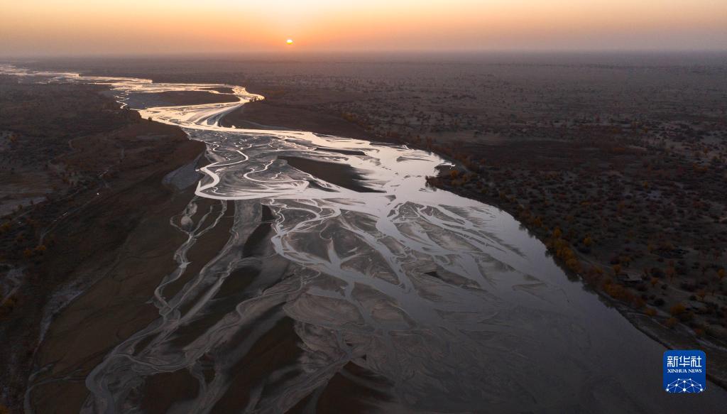 這是在塔克拉瑪干沙漠腹地拍攝的新疆于田克里雅河國家濕地公園(2019年11月10日攝,無人機照片)。