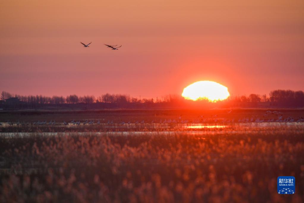 11月4日,候鳥從吉林省白城市鎮賚縣莫莫格國家級自然保護區上空飛過。