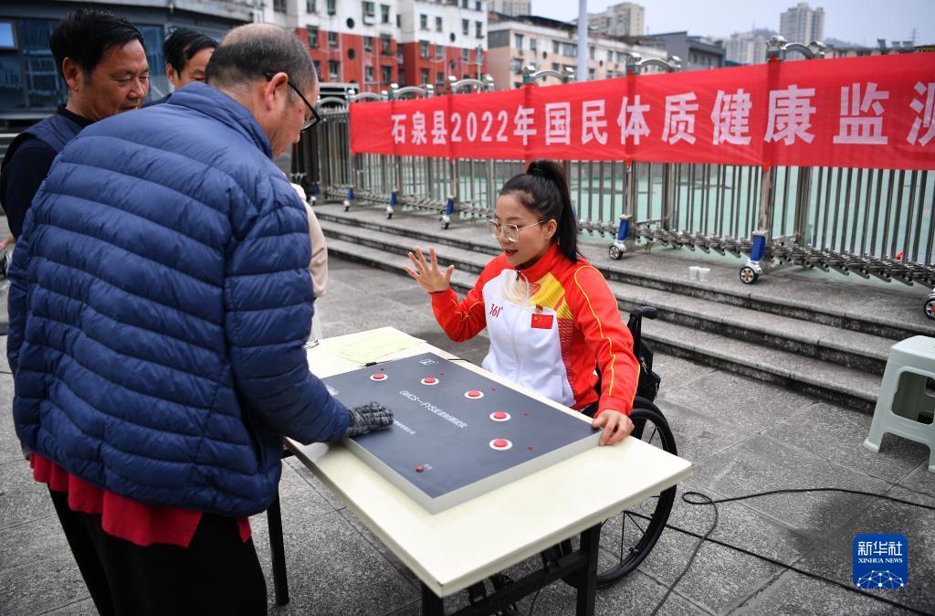 11月4日,在石泉縣開展的國民體質健康監測活動中,夏江波為群眾測量記錄反應時間指標。
