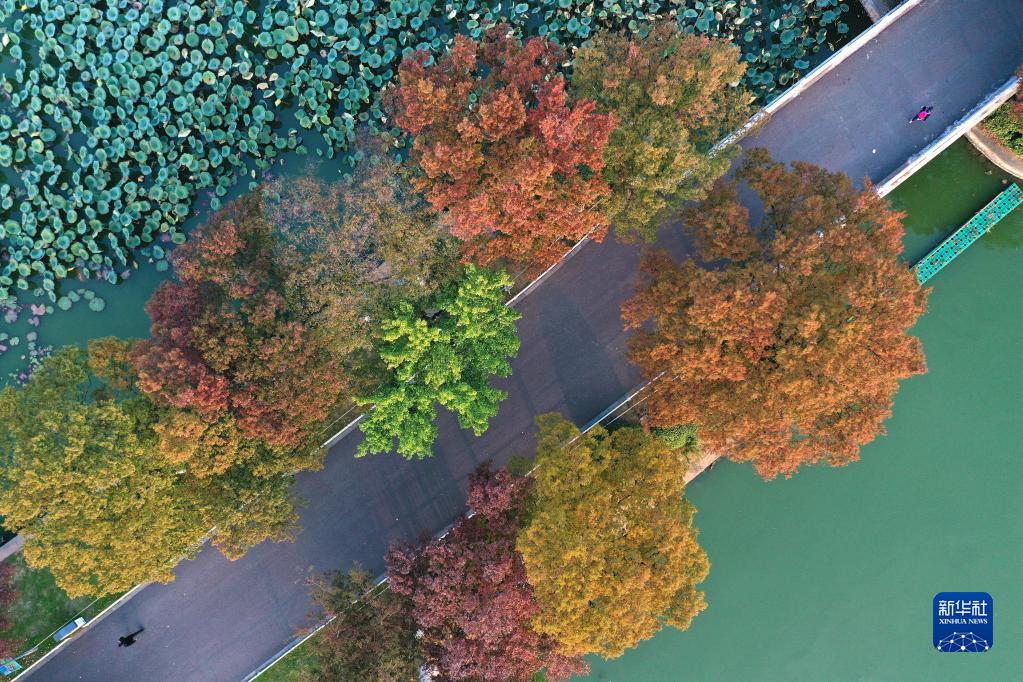 11月2日,市民在江蘇省南京市玄武湖公園長堤上賞秋健身(無人機照片)。 新華社發(楊素平 攝)