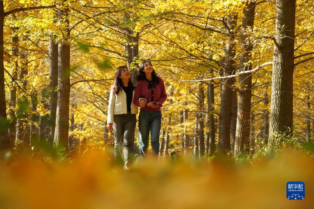 11月2日,游人在山東省臨沂縣沂南縣的銀杏林間游玩賞秋。 新華社發(fā)(尹君 攝)
