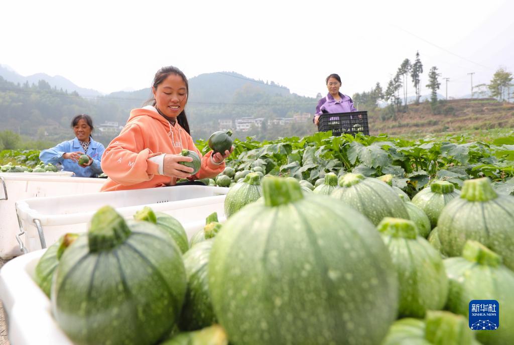 11月5日,村民在貴州省黔東南苗族侗族自治州岑鞏縣思旸鎮盤街村分揀小南瓜。
