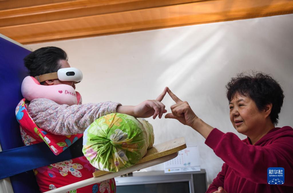 胡燕均幫助女兒進行康復訓練(11月1日攝)。