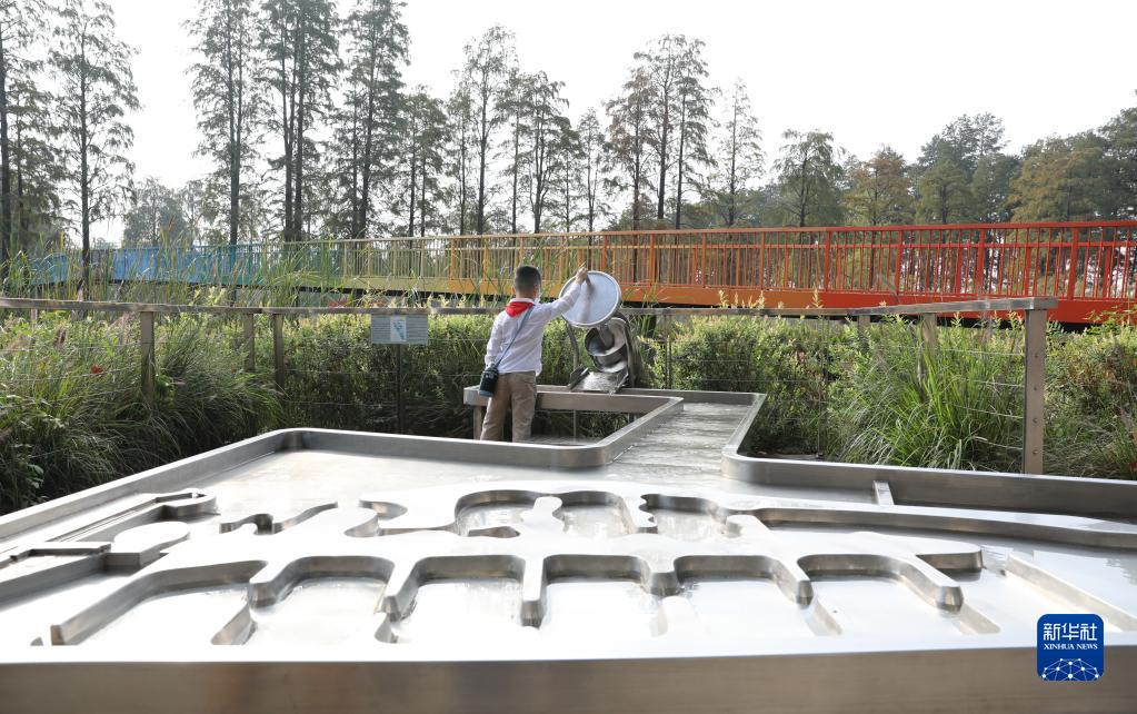 11月5日,小朋友在武漢華僑城生態濕地公園體驗演示水凈化原理的“阿基米德取水器”。