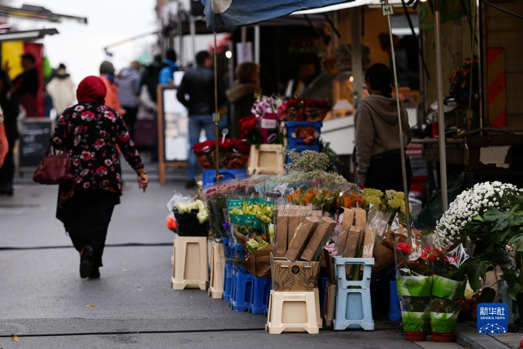 11月4日,在比利時布魯塞爾一市場,行人經過售賣鮮花的攤位。