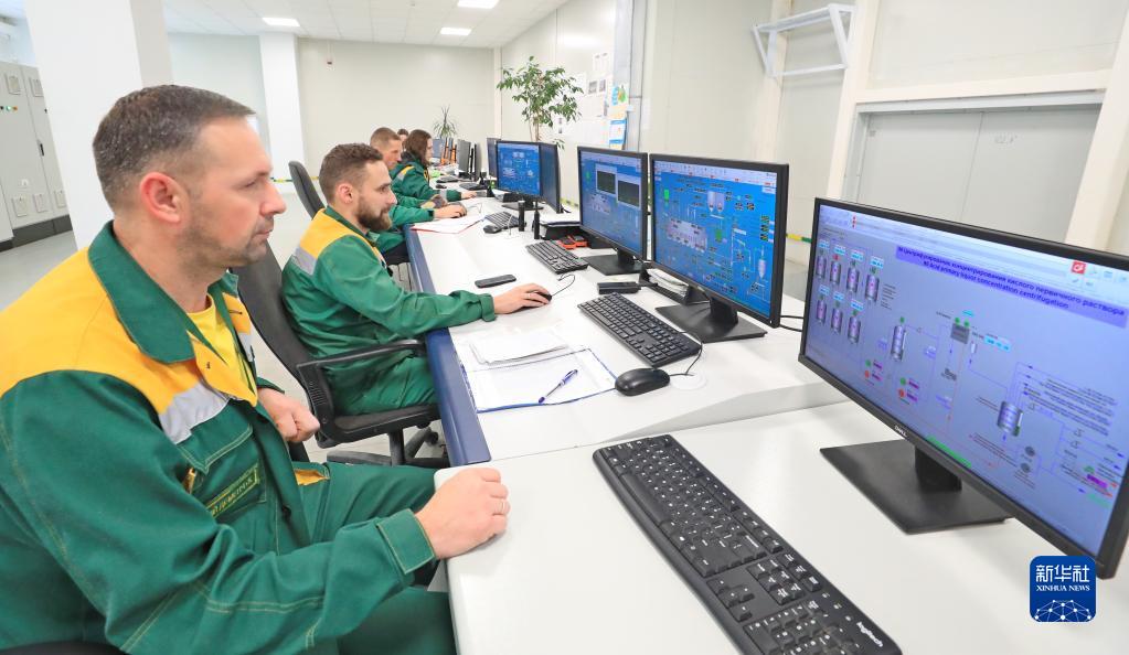 11月4日,在白俄羅斯明斯克州,工人在白俄羅斯國家生物技術公司全循環高科技農工綜合體項目車間內工作。