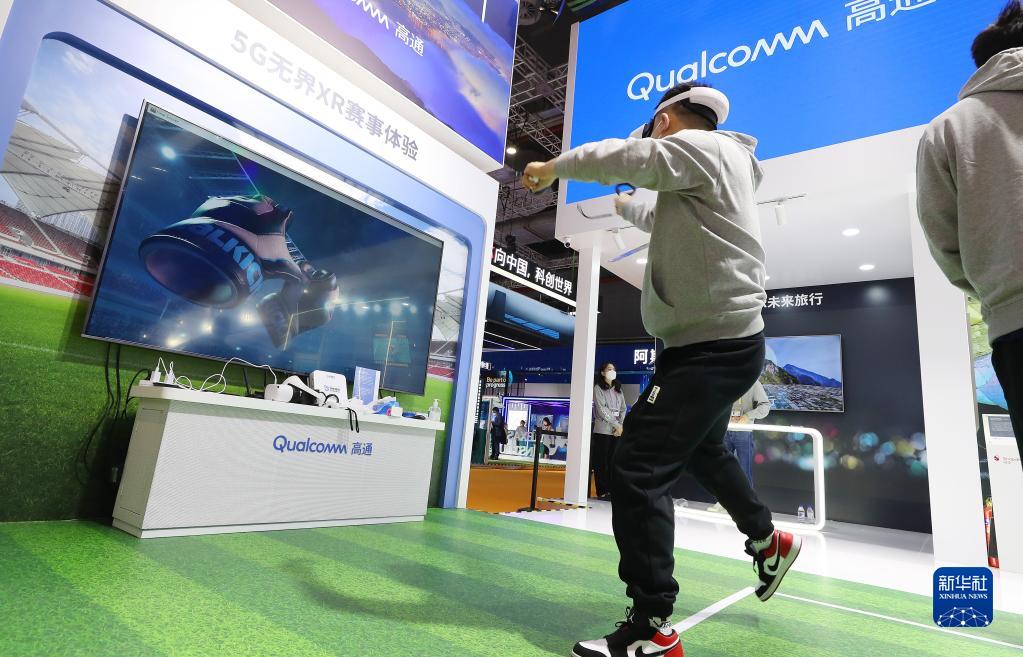 11月5日,參觀者在第五屆進(jìn)博會(huì)技術(shù)裝備展區(qū)內(nèi)體驗(yàn)一款體育游戲。