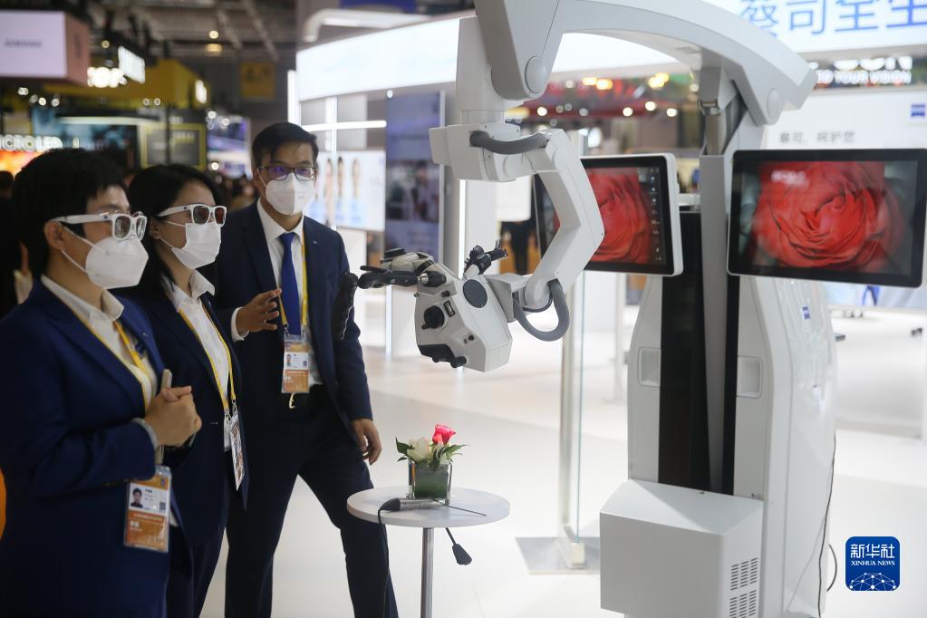 11月5日,參觀者在第五屆進(jìn)博會(huì)技術(shù)裝備展區(qū)蔡司展臺(tái)體驗(yàn)顯微鏡。