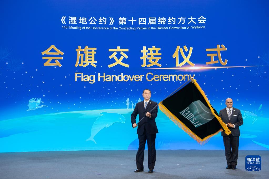 11月5日在《濕地公約》第十四屆締約方大會開幕式上拍攝的會旗交接儀式。