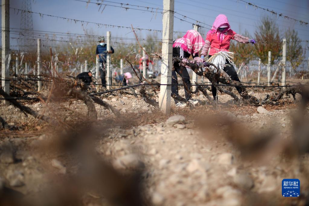 11月5日,在位于寧夏銀川市賀蘭山東麓的藍賽酒莊,農民進行埋藤作業。