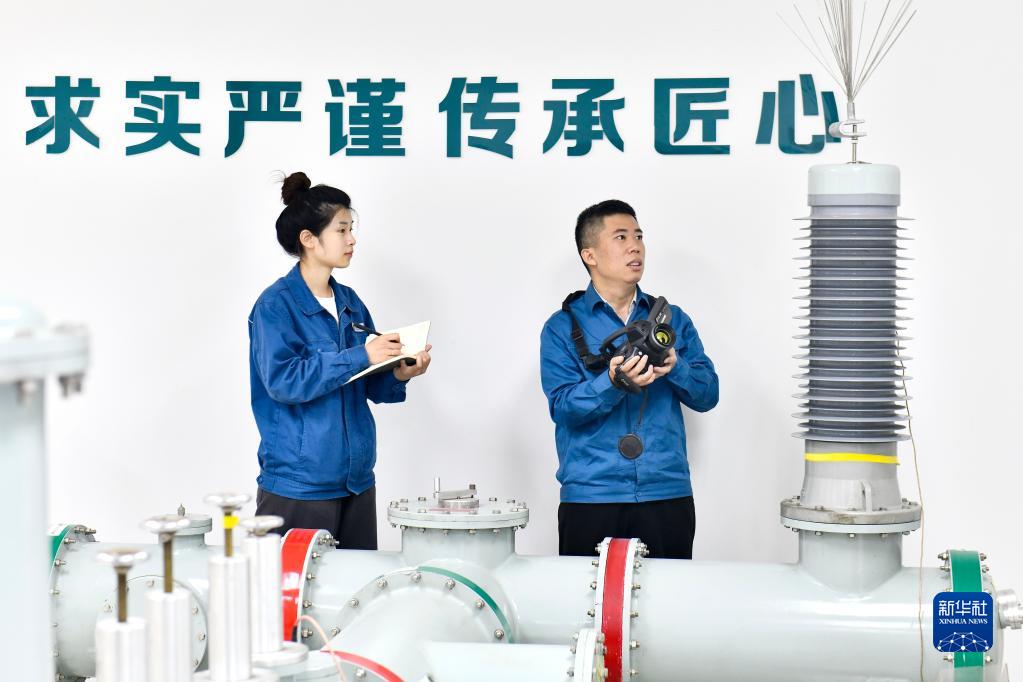 11月5日,馮新巖(右)和同事在國網山東省電力公司超高壓公司山東省特高壓輸變電技術與裝備重點實驗室工作。