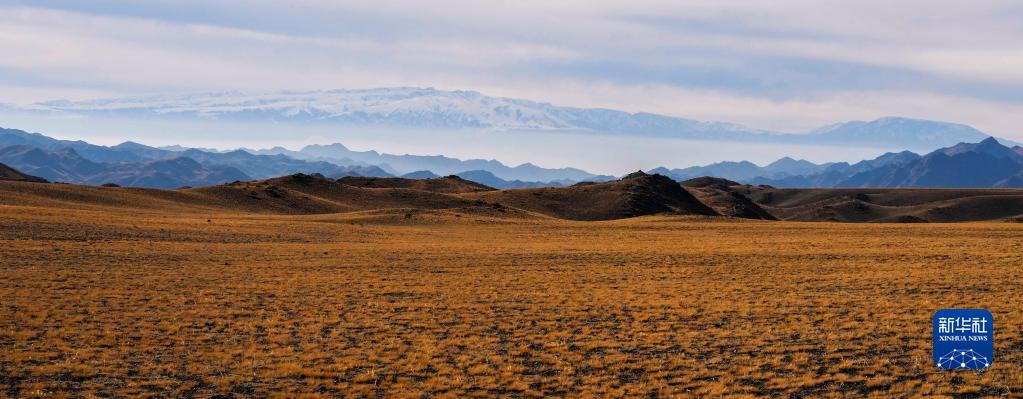 新疆裕民縣巴爾魯克山冬季牧場,遠山覆雪,牧草秋黃(11月4日攝)。