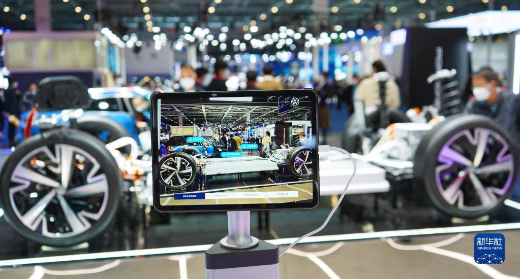 11月6日在第五屆進(jìn)博會(huì)汽車展區(qū)大眾汽車展臺(tái)拍攝的電動(dòng)車模塊化平臺(tái)AR體驗(yàn)系統(tǒng)。