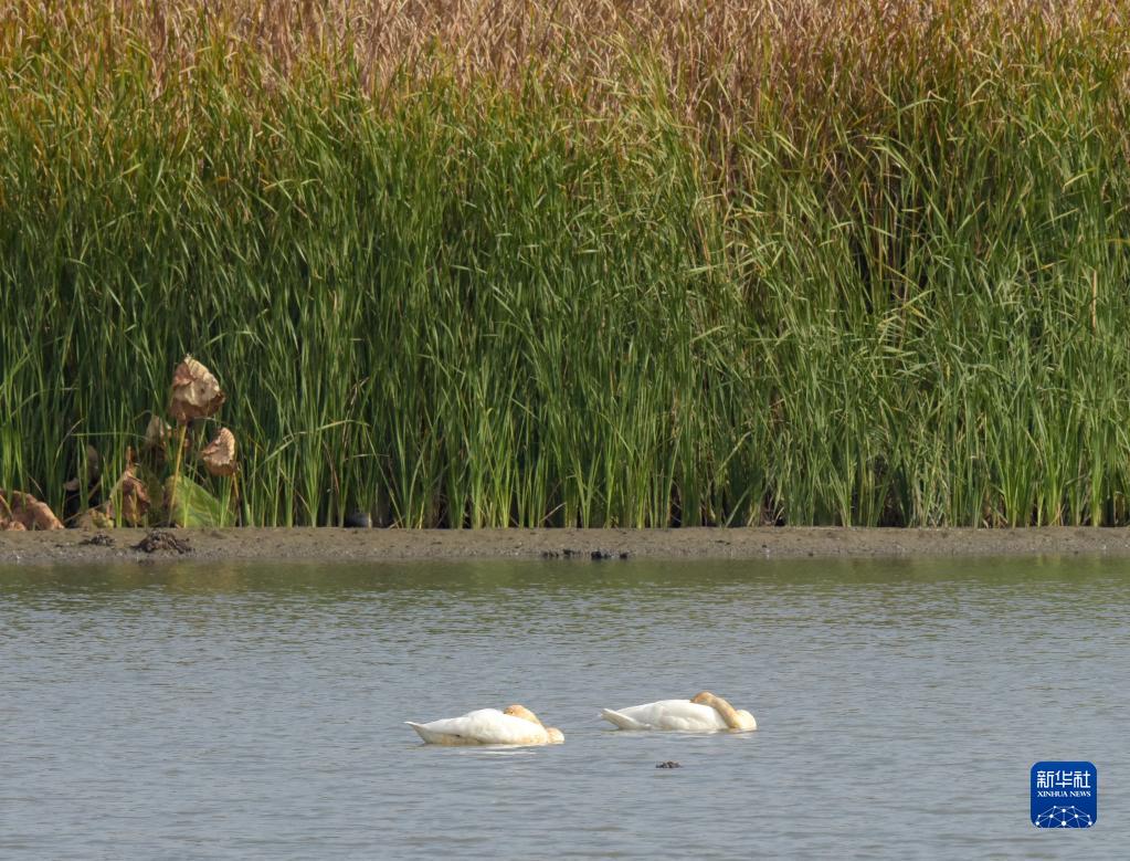 11月5日,兩只小天鵝在安徽巢湖半島國家濕地公園內休憩。