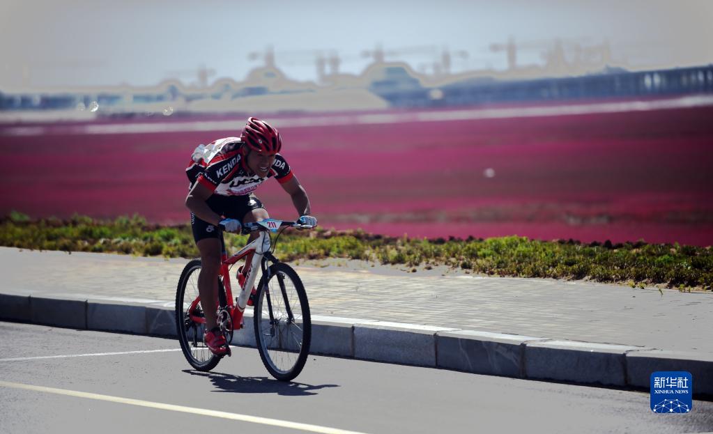一名自行車選手在盤錦紅海灘自行車邀請賽中騎行(2015年5月30日攝)。