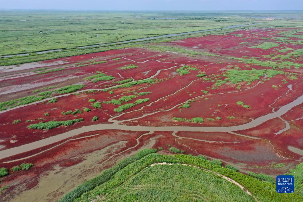 這是遼河入海口旁特有的紅海灘(2021年8月19日攝,無人機照片)。