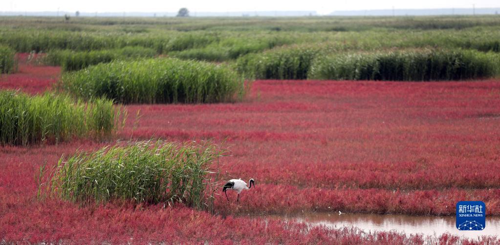 遼河三角洲濕地包括蘆葦沼澤、淺海海域、河流庫塘、水稻田等濕地類型。濕地內分布各類野生動物。特殊環境孕育出的堿蓬草鋪滿灘涂,一到秋天這里就成了“紅色海岸線”。