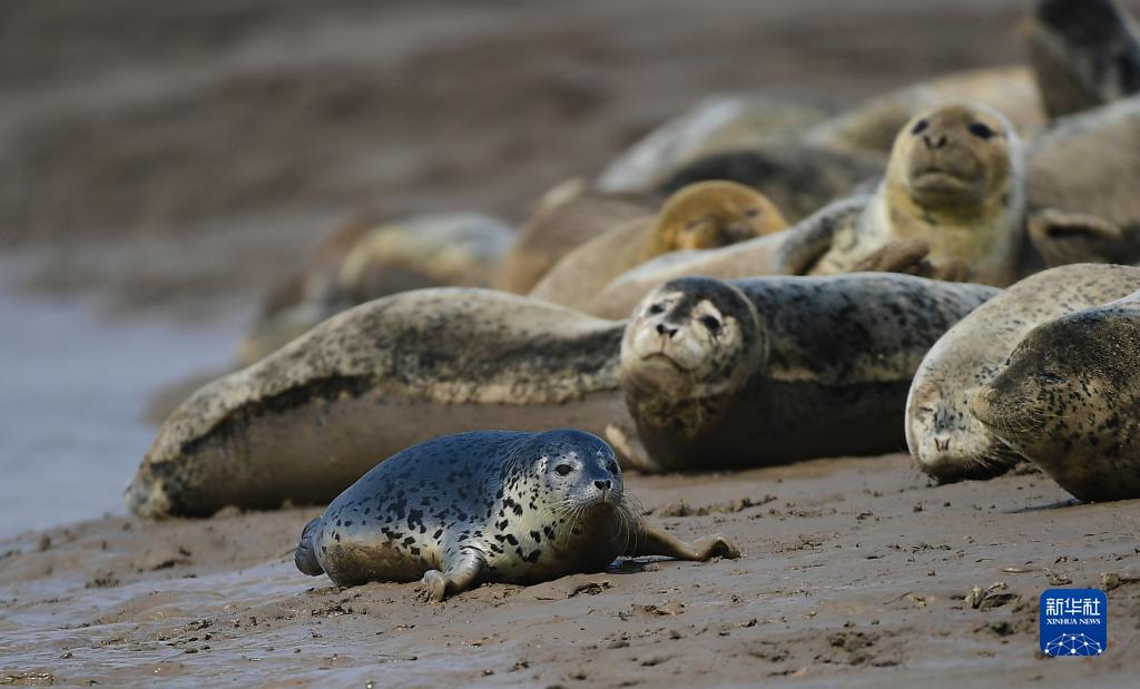 斑海豹在遼寧盤錦三道溝海域的灘涂上小憩(2021年4月20日攝)。