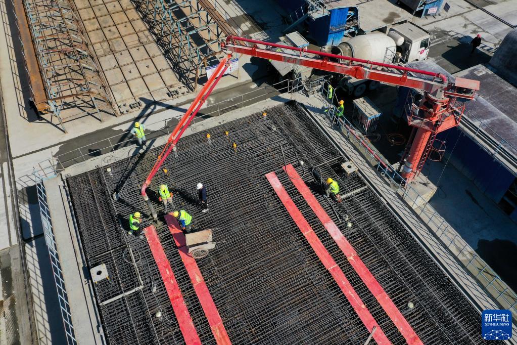 11月7日,中國鐵建大橋局池黃鐵路黃山制梁場施工人員在最后一榀箱梁澆筑現場施工(無人機照片)。
