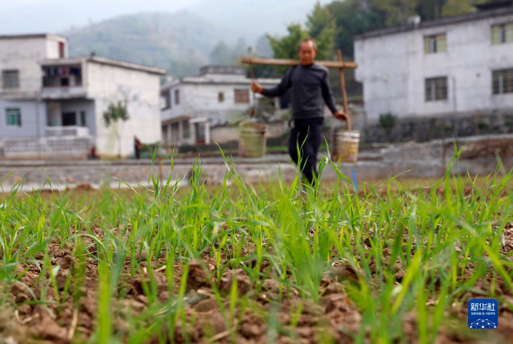 11月7日,貴州省遵義市正安縣安場鎮勝利社區農民在田間管護麥苗。