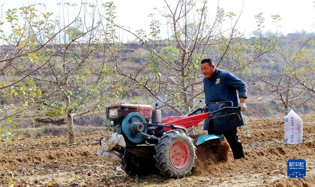11月7日,在甘肅省平?jīng)鍪徐o寧縣威戎鎮(zhèn)楊灣村,果農(nóng)在果園里駕駛農(nóng)機(jī)開溝施肥。