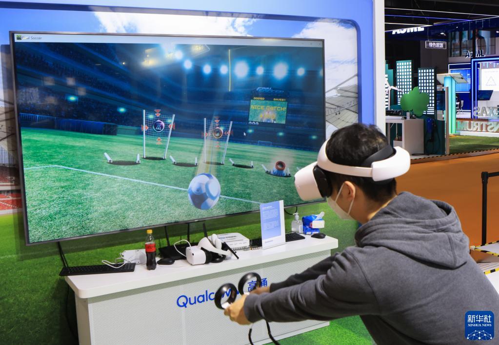 11月7日,參觀者在第五屆進(jìn)博會(huì)美國(guó)高通公司展臺(tái)參加5G無(wú)界XR賽事體驗(yàn)。