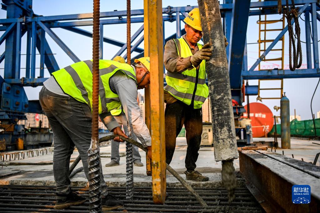 11月7日,在廣西崇左麗江大橋建設現場,工人在進行混凝土澆筑作業。