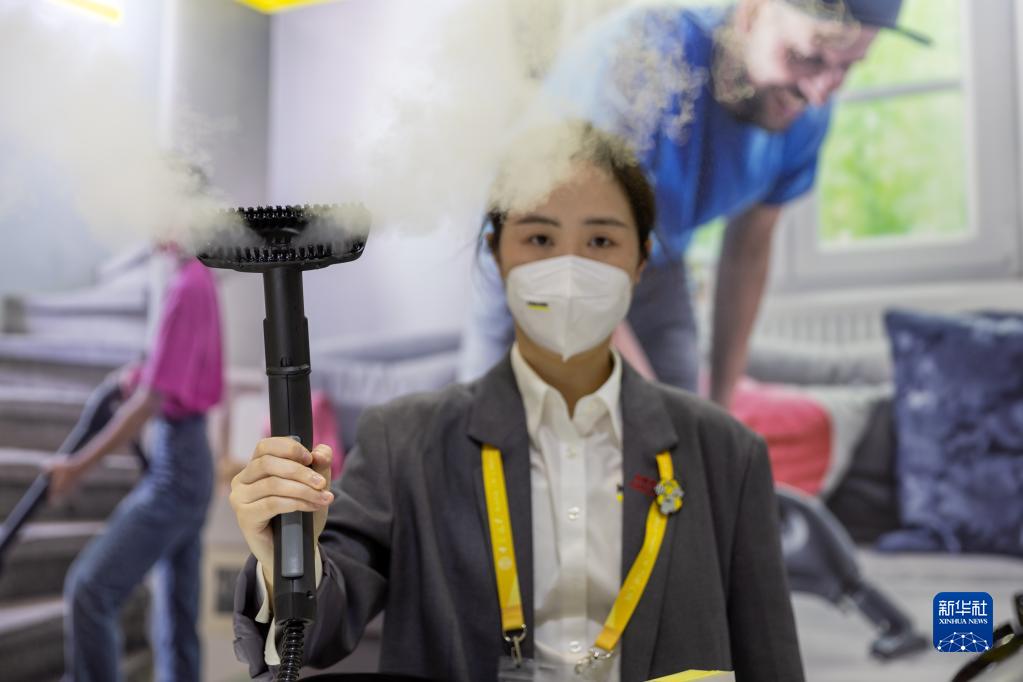 11月7日,在第五屆進博會消費品展區德國卡赫展臺,工作人員演示多功能蒸汽機。該多功能蒸汽機在清潔時只需要水,無需化學清洗劑。