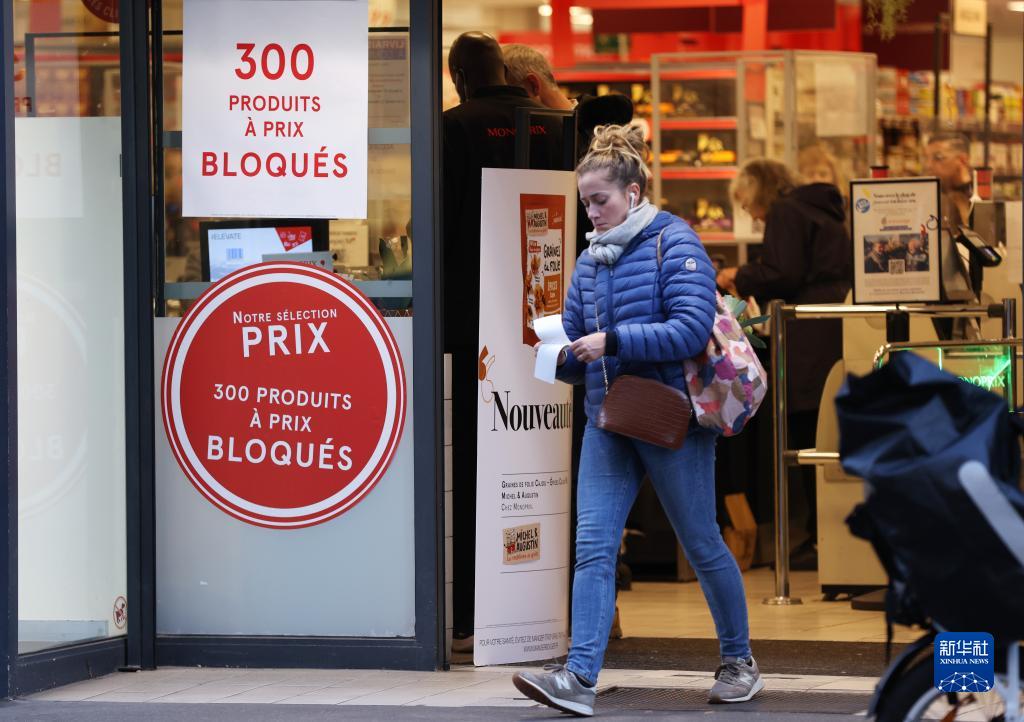 11月7日,在法國巴黎一家貼有“我們精選300種限價商品”字樣的超市外,一名女子檢查手里的購物小票。