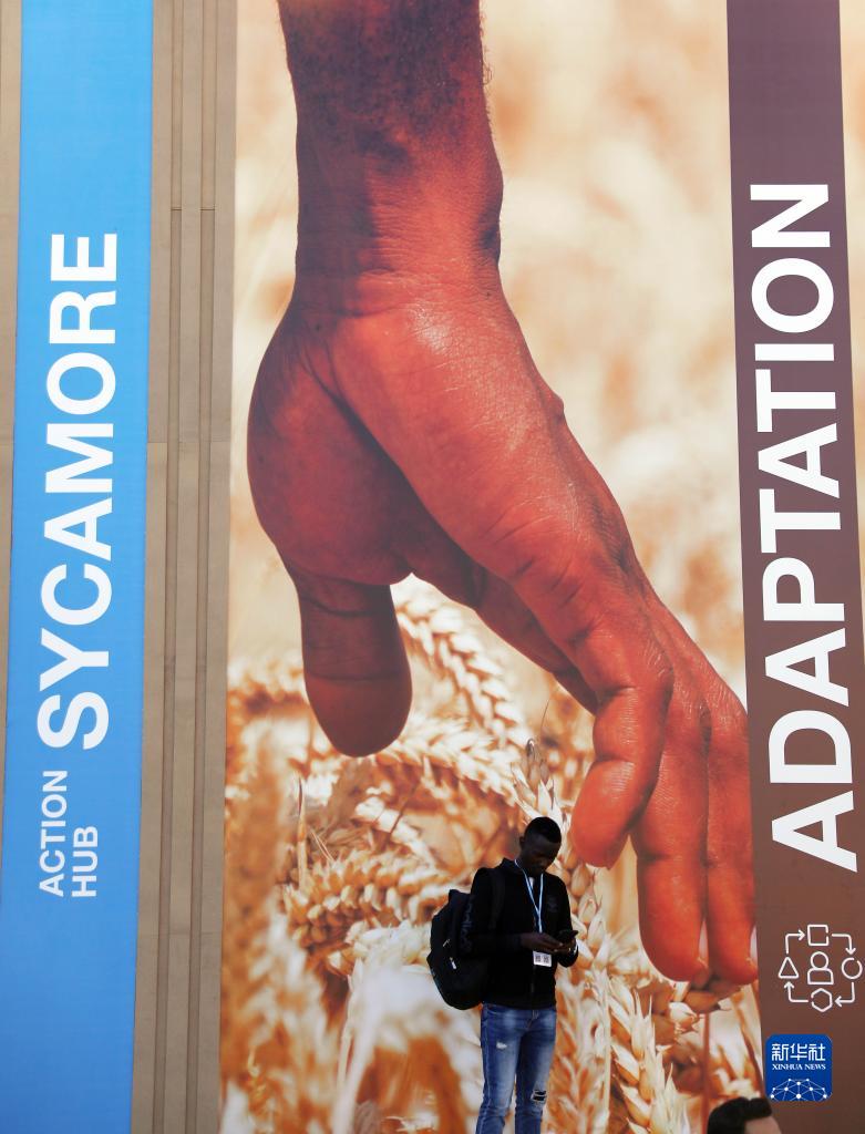 11月7日,在埃及沙姆沙伊赫的聯合國氣候變化大會舉辦場地,一名參會者站在一張宣傳海報前。