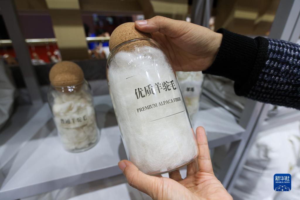 11月7日,在第五屆進博會上,新西蘭太平洋羊駝集團公司工作人員在展臺介紹優質羊駝毛。