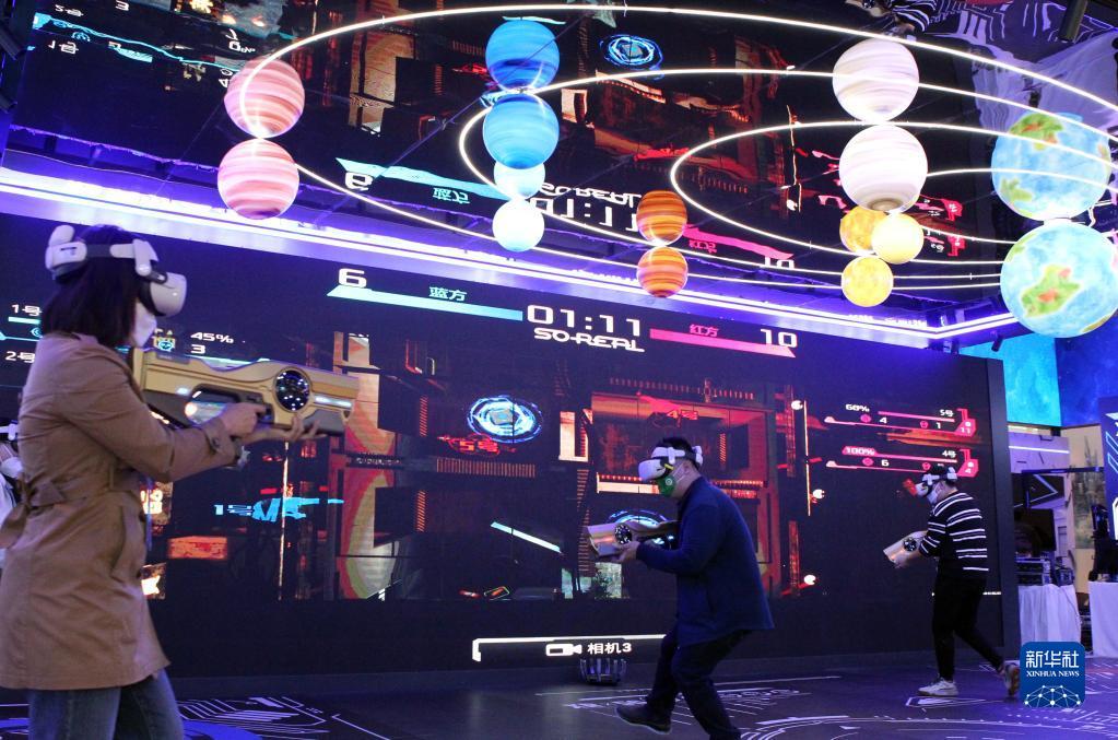 11月7日,在第五屆進博會技術裝備展區的人工智能專區,體驗者借助VR設備進行電競互動游戲。