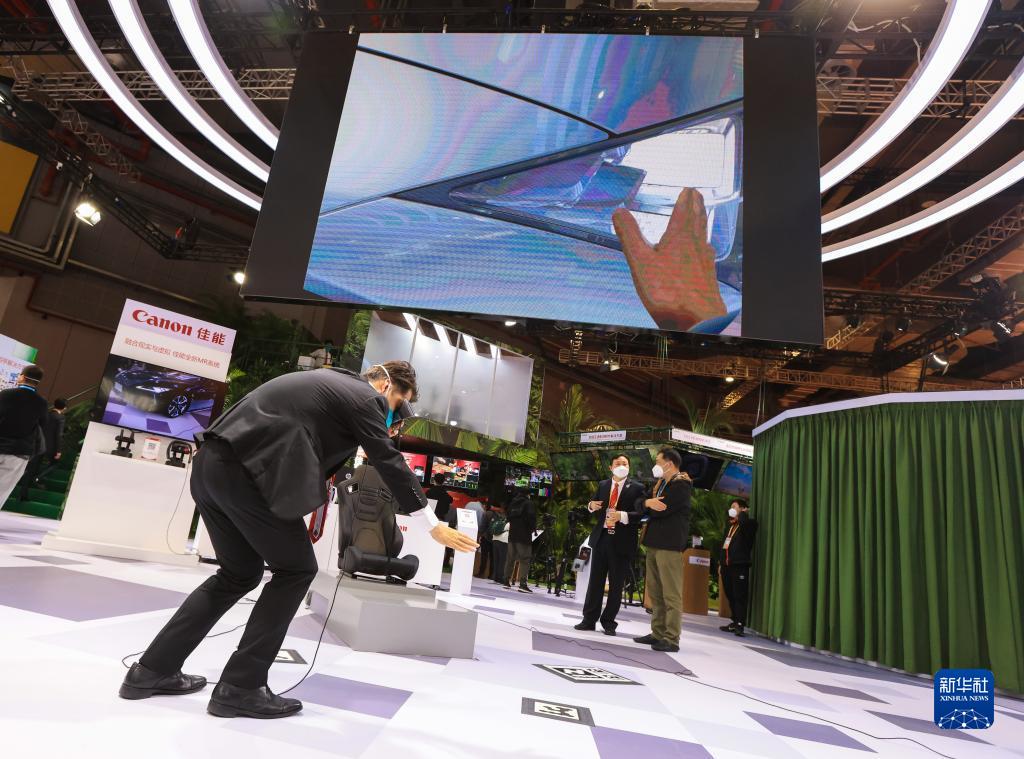 11月7日,展商在第五屆進(jìn)博會(huì)佳能展臺(tái)演示MR虛擬現(xiàn)實(shí)系統(tǒng)。