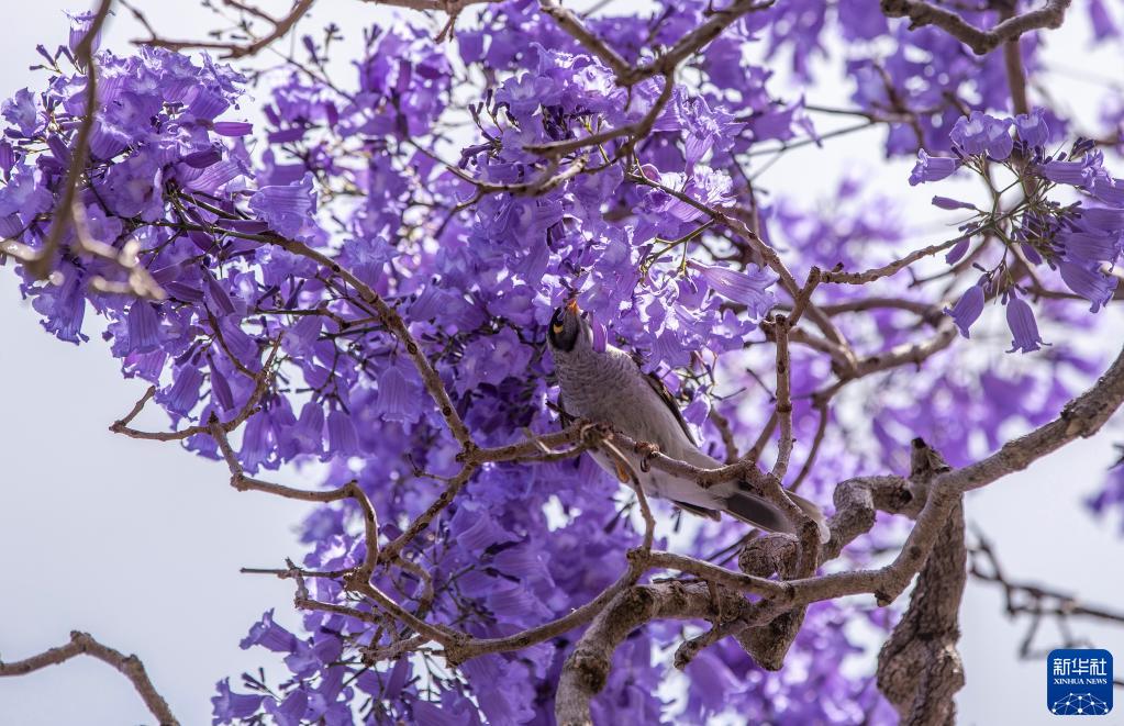 11月8日,在澳大利亞悉尼,一只黑頭礦鳥停在藍花楹樹上。
