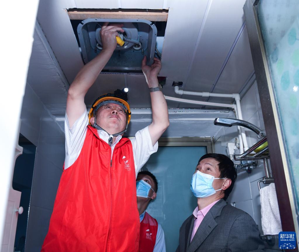 11月8日,錢海軍(左一)帶領志愿者為社區居民開展室內線路檢修。