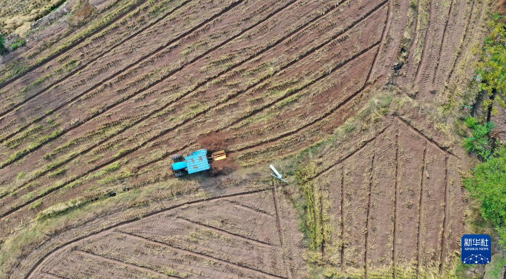 11月8日,浙江省臺州市仙居縣雙廟鄉(xiāng)農(nóng)民駕駛機械開溝整土,準備種植油菜(無人機照片)。
