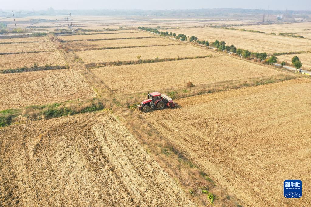 11月8日,江蘇省句容市郭莊鎮(zhèn)葛村村農民駕駛農機在田里播種冬小麥(無人機照片)。