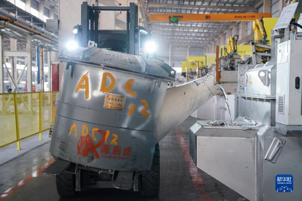11月7日,在安徽省馬鞍山市含山縣三基輕合金成型科技有限公司,工人操作叉車向壓鑄機的燃氣保溫爐內添加鋁液。
