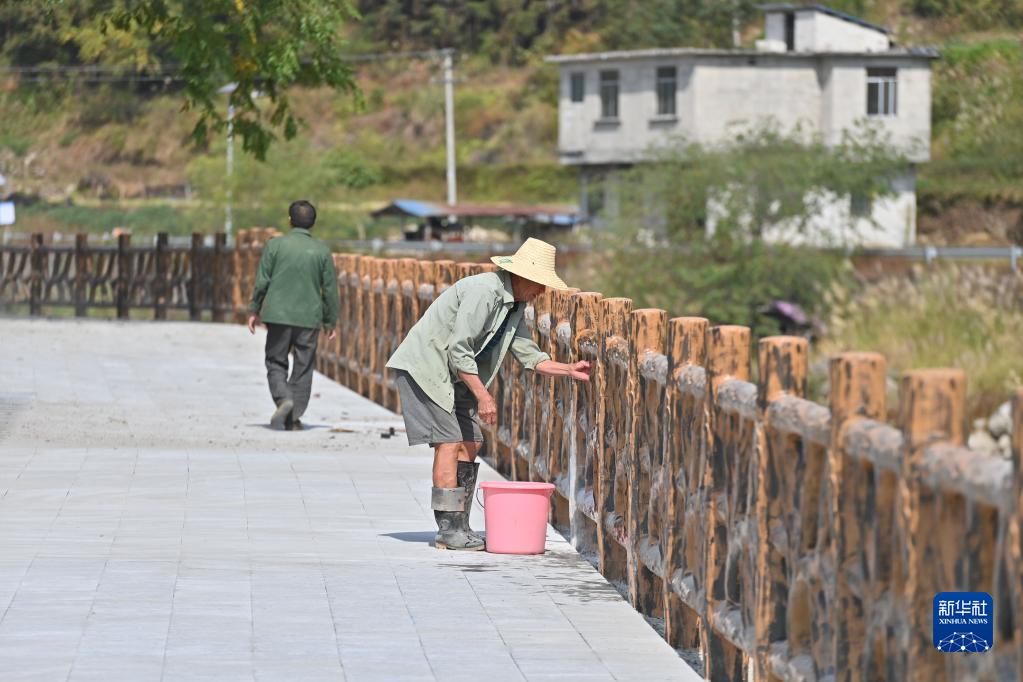 在廣西融水苗族自治縣香粉鄉雨卜村,工人在清洗剛剛建好的親水平臺欄桿(11月8日攝)。粵桂協作資金正助推雨卜村鄉村旅游產業發展。