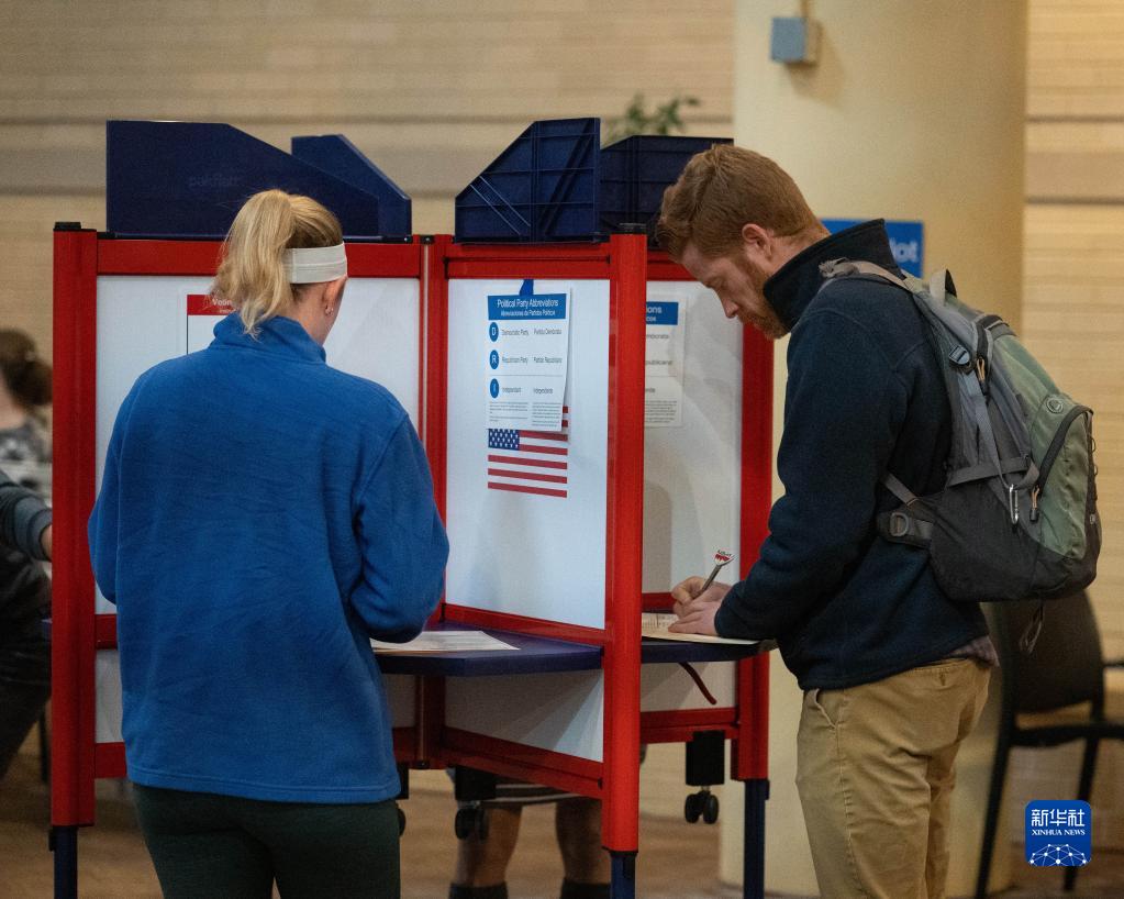 11月8日,選民在美國(guó)弗吉尼亞州阿靈頓的一處投票點(diǎn)參加中期選舉投票。