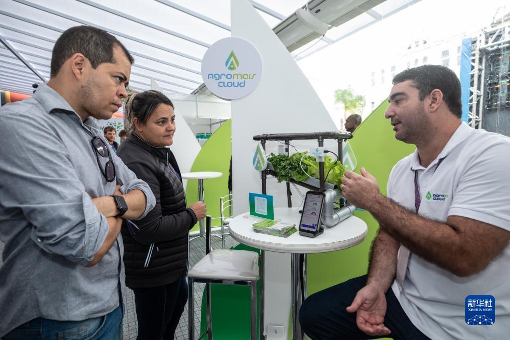 11月8日,在巴西里約熱內(nèi)盧,工作人員在“里約創(chuàng)新周”上為參觀者講解一款植物生長監(jiān)測(cè)系統(tǒng)。