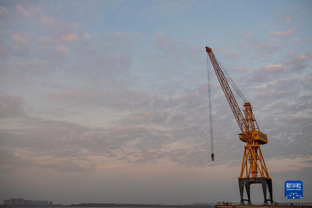 改造后的武漢市青山江灘一角保留了過去使用過的吊裝設備,成為青山江灘的代表性景觀(11月8日攝)。