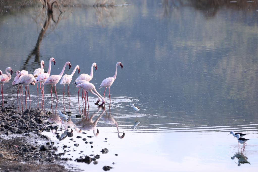 這是11月6日在肯尼亞博戈里亞湖拍攝的火烈鳥。