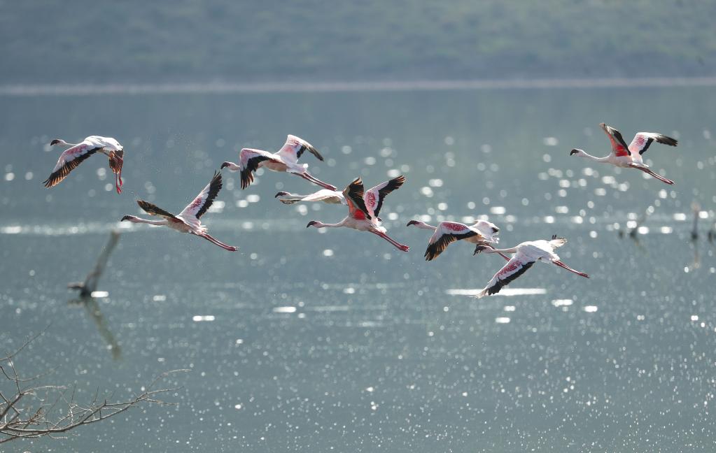 這是11月6日在肯尼亞博戈里亞湖拍攝的火烈鳥。